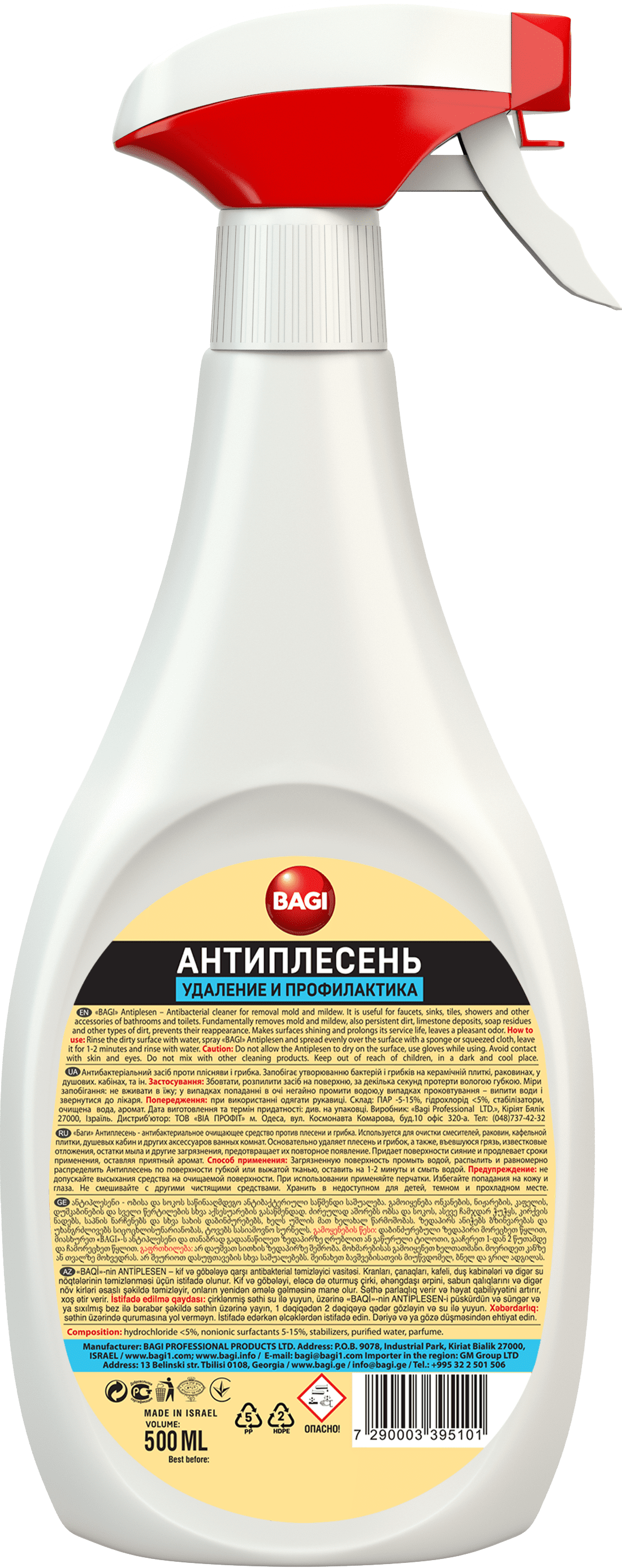 «BAQİ»-nin ANTİPLESEN – kif və göbələyə qarşı antibakterial təmizləyici vasitəsi. Kranları, çanaqları, kafeli, duş kabinələri və digər su nöqtələrinin təmizlənməsi üçün istifadə olunur. Kif və göbələyi, eləcə də oturmuş çirki, əhəngdaşı ərpini, sabun qalıqlarını və digər növ kirləri əsaslı şəkildə təmizləyir, onların yenidən əmələ gəlməsinə mane olur. Səthə parlaqlıq verir və həyat qabiliyyətini artırır, xoş ətir verir.